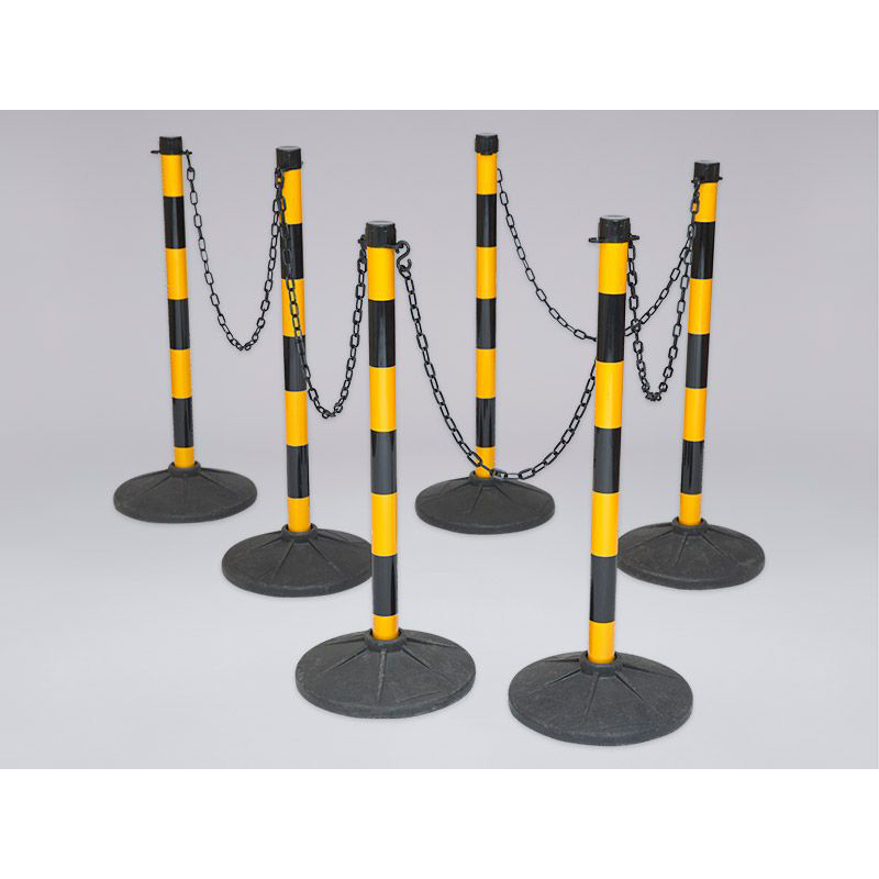 Easy to build set includes 6 yellow & black plastic posts, 6 rubber bases & 10m of plastic chain.